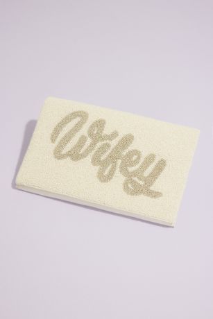 This cute clutch spells out "Wifey" in silver script beading on an allover ivory beaded background.