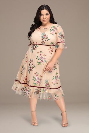 This romantic midi dress is adorned with floral embroidery and velvet trim. Ruffles at the sheer elbow sleeves and A-Line hem add movement and playfulness.