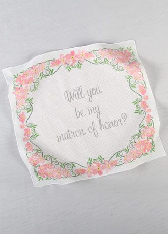 Ask your matron of honor to stand up in your wedding with one of these beautiful vintage style hankies. Offered in a selection of soft yet fun colors in a floral print with a polka dot background, these hankies are sure to show how much your matron of honor means to you.