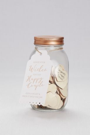 A sweet way for guests to share their congrats, this wishing jar includes 100 wooden hearts for guests to sign, and a slotted-lid glass jar to slip them into.