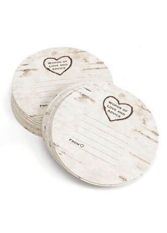 Start married life off with heartfelt advice from all your wedding guests! Set out these round coasters at the reception and let the fun begin. The coasters feature a birch wood grain design with a carved-heart design at the top. The phrase "Words of Love and Advice" are printed inside the heart.