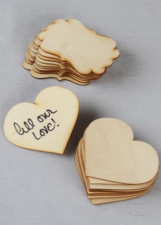These wood guest cards are perfect to have guests write well-wishes to the happy couple. Offered in both a heart and fancier shape, these are best paired with a rustic guest book box. A permanent marker is recommended.