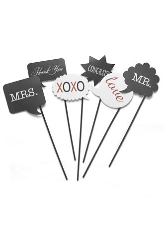 Let guests go crazy creating their own fun photos and messages with this word bubble prop set! The set includes six props made of heavy-weight paper printed with wording: Mr., Mrs., Love, XOXO, Thank You, and Congrats!
