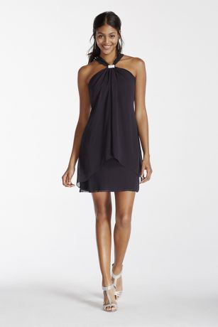 - Short, knee-length dress features a soft chiffon tier for added drama and movement.