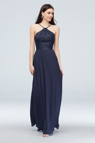 Embroidered floral blooms and leaves adorn the bodice of this Y-neck georgette bridesmaid dress. A grosgrain ribbon encircles the waist to complete the look.