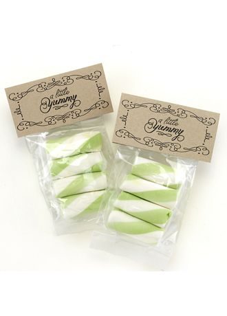 Who wouldnt enjoy a little yummy treat? Entice guests to savor a reception treat in these clear cellophane bags sealed with a kraft treat topper cards. Both sides of the topper are printed with "A Little Yummy" and a vintage-inspired design in black.